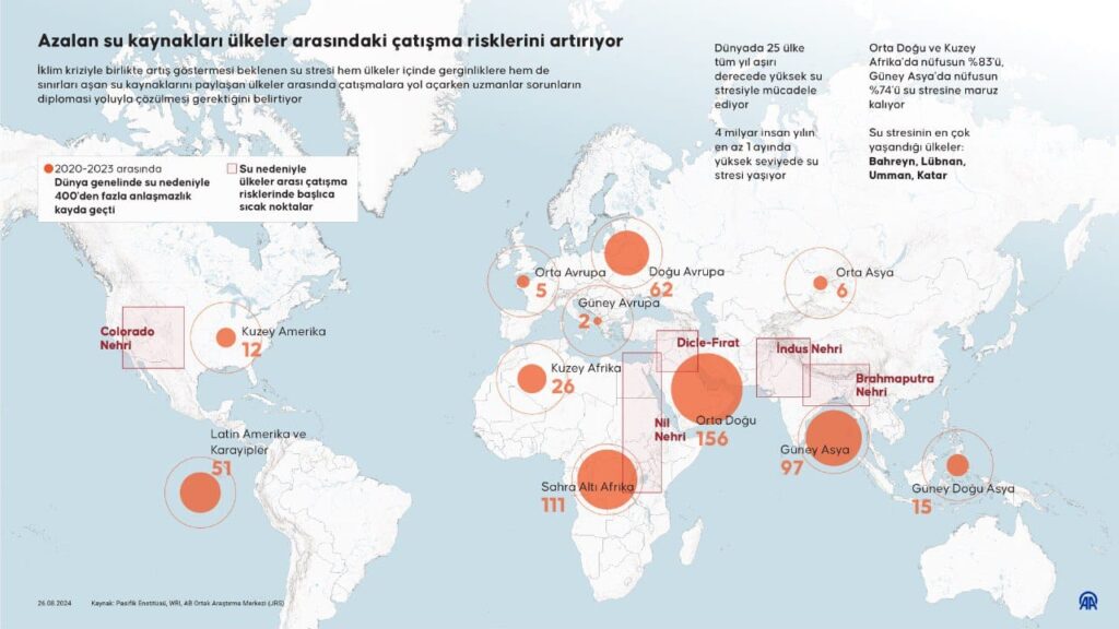 ABD merkezli Pasifik Enstitüsünün çalışmalarına göre, sadece 2020’den 2023’e kadar dünya genelinde su nedeniyle 400’den fazla anlaşmazlık kayda geçerken ülkeler arasında veya ülke içinde yaşanan bu anlaşmazlıkların bazıları çatışmalara dönüştü.