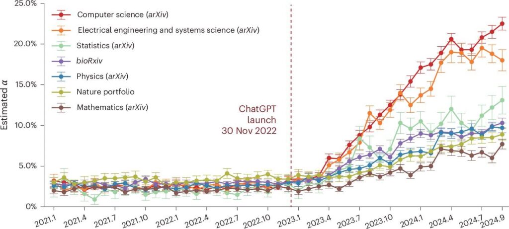 Alan olarak ise en dramatik artış bilgisayar bilimlerinde yaşandı. 2024 Eylül itibarıyla bilgisayar bilimi çalışmalarının özetlerinin yüzde 22,5’i ve giriş bölümlerinin yüzde 19,5’i muhtemelen LLM ile düzenlenmişti. Kasım 2022’de ise bu oranlar yalnızca yüzde 2,4 civarındaydı. Tüm makale türlerinde benzer oranlar bulundu.