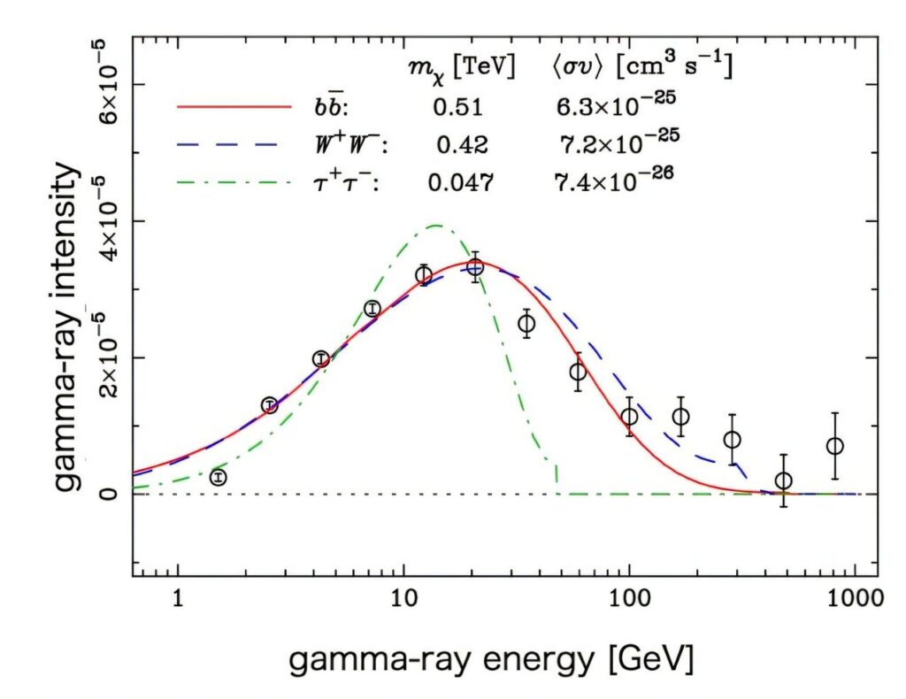Gözlemlenen enerji spektrumu (gama ışını yoğunlukları dağılımı), neredeyse protonun 500 katı kütleye sahip varsayımsal WIMP’lerin yok oluşuyla ortaya çıkması beklenen emisyona uyum gösteriyor. Gama ışını yoğunluğundan hesaplanan WIMP yok oluş sıklığı da teorik tahminlerle uyumlu çıktı.