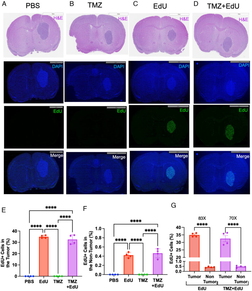 Aynı yaklaşım GBM8 hücre hattı içeren modellerde de test edildi. Kombinasyon tedavisi alan tüm fareler —ister 1 mg/kg TMZ + 200 mg/kg EdU, ister 5 mg/kg TMZ + 200 mg/kg EdU olsun— 170 gün sonunda halen hayattaydı ve tümörden arınmışlardı.