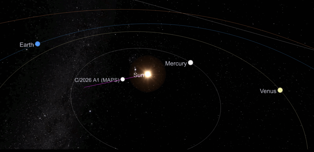 C/2026 A1 (MAPS), 13 Ocak’ta Atacama çölündeki bir teleskobu uzaktan kumandayla kullanan dört amatör astronom (gökbilimci) tarafından tespit edildi. Cismin, “Kreutz sungrazers” denen, Güneş’e çok yakın geçiş yapan kuyruklu yıldızlar grubunun üyesi olduğu belirlendi. Bu gruba, şimdiye kadar görülen en parlak kuyruklu yıldızların çoğu dahil.