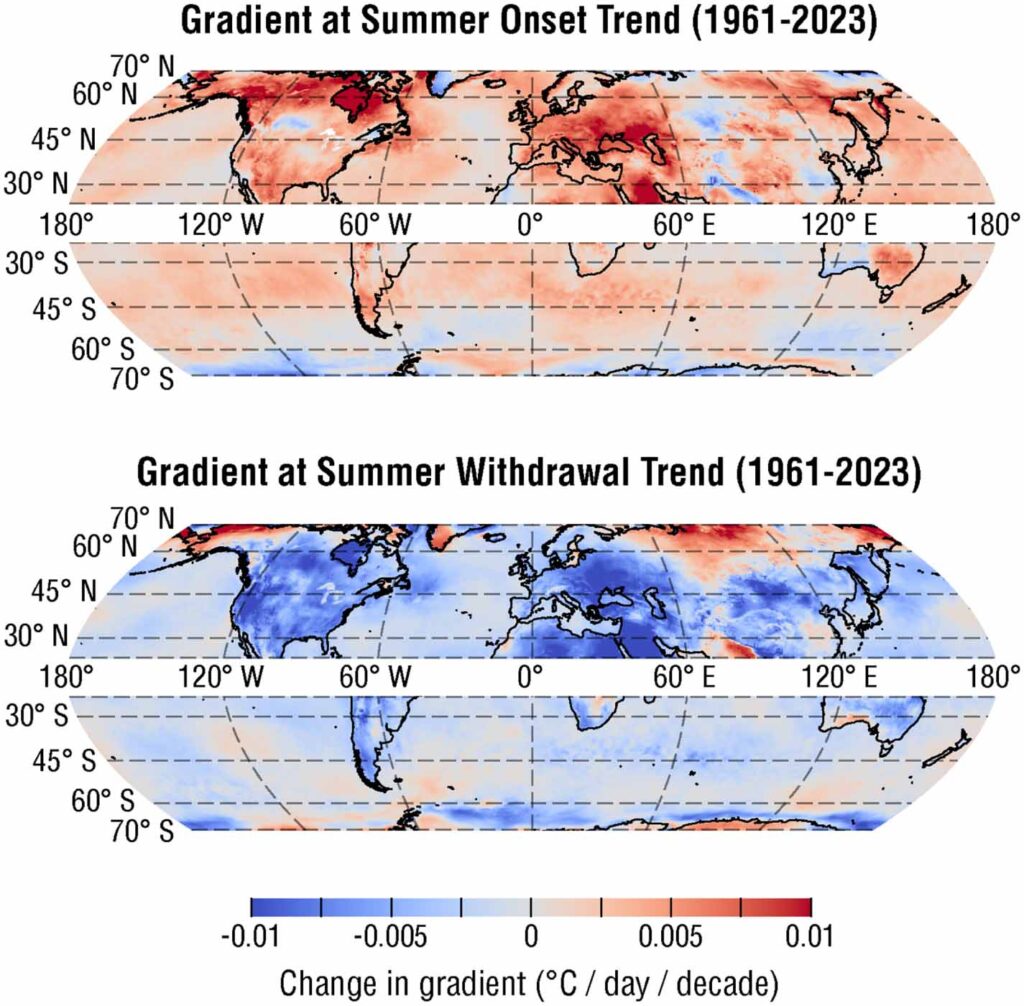 Çalışma ayrıca mevsimler arası geçişlerin, örneğin ilkbahardan yaza ve yazdan sonbahara geçişlerin daha ani hale geldiğini ortaya koydu. Artık kademeli bir ısınma yerine, yaz benzeri sıcaklıklar daha birdenbire ortaya çıkıyor. Bu da mevsimsel işaretlere bağlı sistemleri olumsuz etkileyebilir. Örneğin çiçekler, tozlayıcılar henüz aktif olmadan açabilir; ekinlerin daha erken ekilmesi gerekebilir; hızlı ilkbahar ısınması karların daha hızlı erimesine ve ilkbahar sel riskinin artmasına yol açabilir.