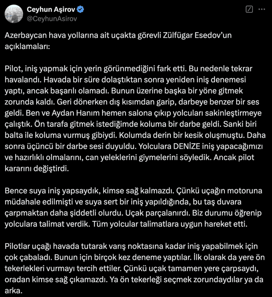 Özel haber: Azerbaycan Havayolları’na ait yolcu uçağı, 25 Aralık 2024 tarihinde iniş yapmak üzereyken düştü. Trajik kazayla ilgili farklı iddialar tartışılıyor.