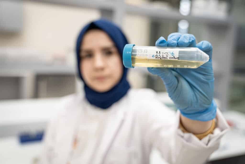 Erzurum Teknik Üniversitesi’nde doktora öğrencisi olan Merve Şimşek Geyik, tez çalışması kapsamında kıraç bölgelerden topladığı bitkilerden endofitik (bitki büyüme ve gelişmesini destekleyen mikroorganizma) bakterileri Yüksek Teknoloji Araştırma Merkezi’nde “Tohum Teknolojisi ve Üretim Ar-Ge Laboratuvarı”nda izole etti. Doç. Dr. İsmal Bezirganoğlu’nun danışmanlığında bakterileri steril şartlarda yonca ve serada da mısıra uygulayan Geyik, TÜBİTAK desteğiyle ürettiği ve kimyasal içermeyen bu solüsyonun kuraklığa karşı dayanıklı olduğunu belirledi.