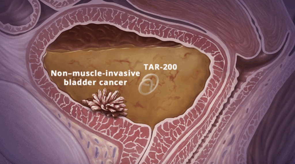 TAR-200 cihazı, kemoterapi ilacı “gemcitabine” içeren, simit şeklinde küçük bir implant. Bir kateter yardımıyla mesaneye yerleştiriliyor ve her tedavi döngüsünde üç hafta boyunca ilacı yavaş yavaş salıyor.